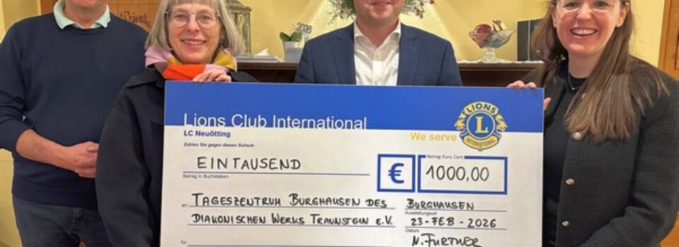 Neuötting/Burghausen – Eine großzügige Spende in Höhe von 1.000 Euro überreichten Präsidentin Nikola Furtner und Schriftführer Dr. Johannes Rochner vom Lions Club Neuötting-InnSalzach bei ihrem Besuch im Tageszentrum Burghausen. Mit einem symbolischen Scheck unterstrichen sie die Wertschätzung des Clubs für die wichtige soziale Arbeit vor Ort. Elisabeth Borst, Leiterin des Sozialpsychiatrischen Dienstes (SpDi) Altötting, erläuterte […]